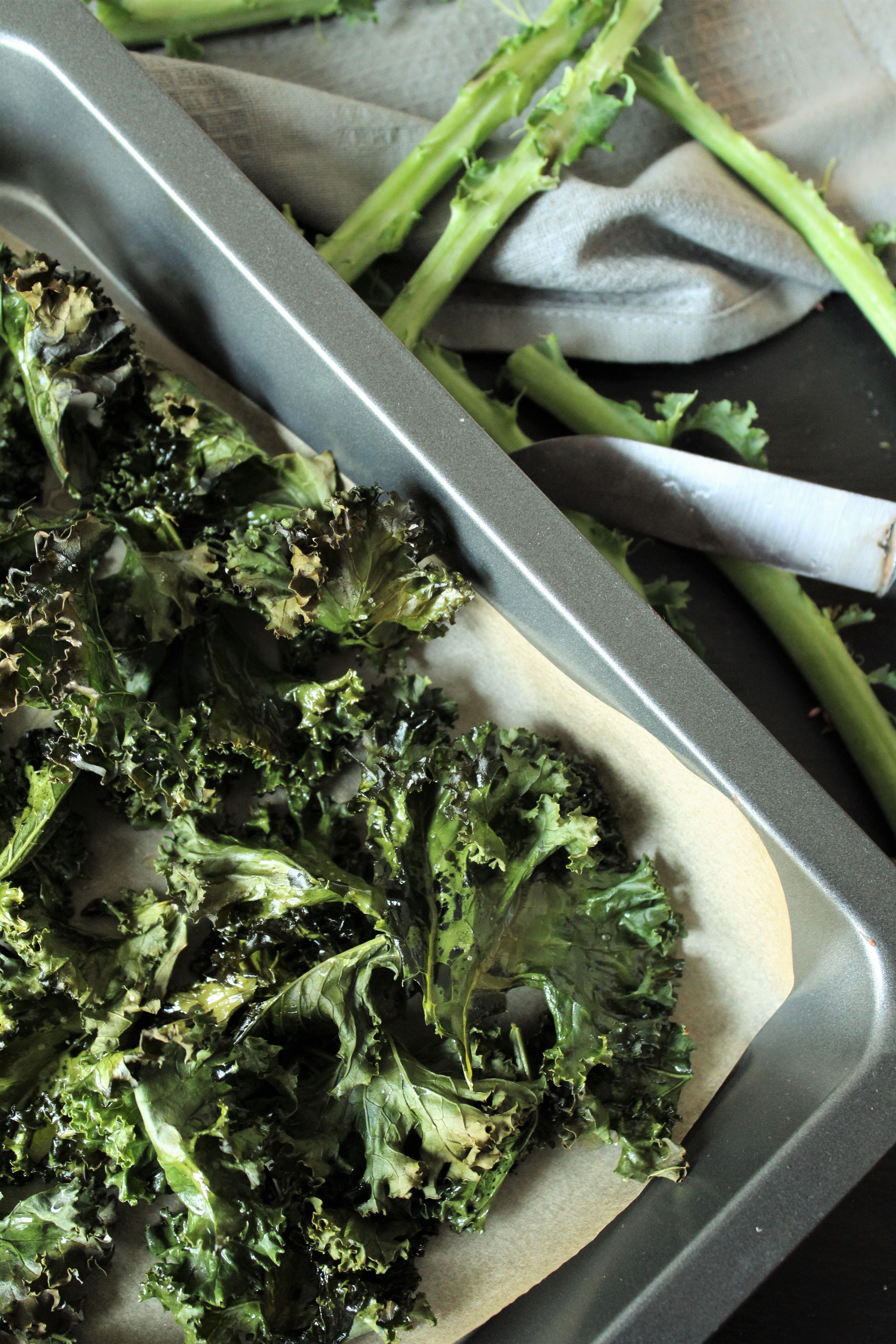 Zubereitung (30 Minuten): 1. Ofen auf 180°C vorheizen. 2. Grünkohl waschen. 3. Grünkohl von den Stielen zupfen und auf ein Backblech geben. 4. Grünkohl mit Öl beträufeln. 5. Etwas Salz über den Grünkohl streuen. 6. Grünkohl ca. 15-20 Minuten backen. In den letzten fünf Minuten im Auge behalten. 7. Grünkohlchips auf Küchenpapier auskühlen lassen.