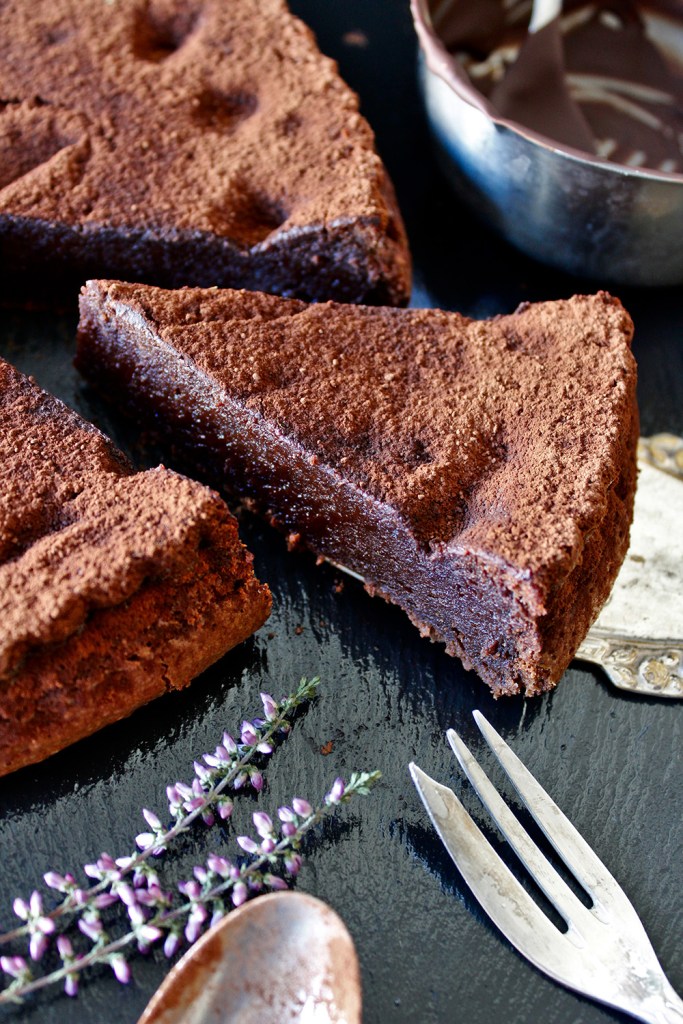 Zutaten (1 Kuchen | 8 Kuchenstücke): 200 Gramm Zartbitter-Schokolade | 200 Gramm Butter | 100 Gramm Zucker | 4 Eier | 2 Esslöffel Mehl | 50 Gramm schwach entöltes Kakaopulver | 1 Prise Salz | Tarte-Form