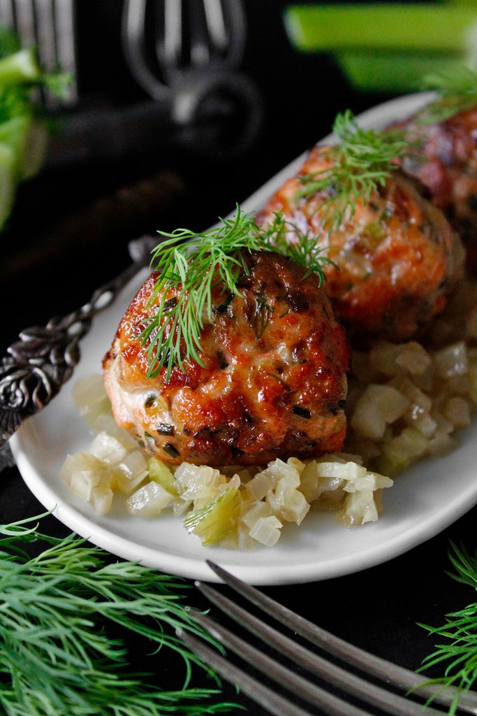 Zutaten (18 Stück): 450 Gramm Lachsfilet (entspricht einer 900 Gramm Lachsforelle) | 175 Gramm Räucherforelle | 200 Gramm Zwiebeln | 200 Gramm Fenchel | 3 Esslöffel brauner Zucker | 100 Milliliter Weißwein | 80 Milliliter Olivenöl | 2 Eier | 1 Brötchen vom Vortag | 10 Gramm Schnittlauch | 10 Gramm frischer Dill | 1 Teelöffel Salz | 0,5 Teelöffel Pfeffer