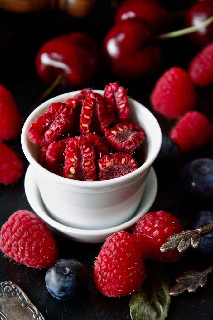 Zubereitung (circa 24 Stunden): 1. Himbeeren in Spalten schneiden. 2. Himbeeren bei 70° Grad für 24 Stunden im Dörrautomat trocknen. Alternativ können die Himbeeren auch im Backofen getrocknet werden. Hierbei sollten die Himbeeren ggf. in Etappen getrocknet werden, um sicherzustellen, dass der Backofen nicht unbeobachtet ist.