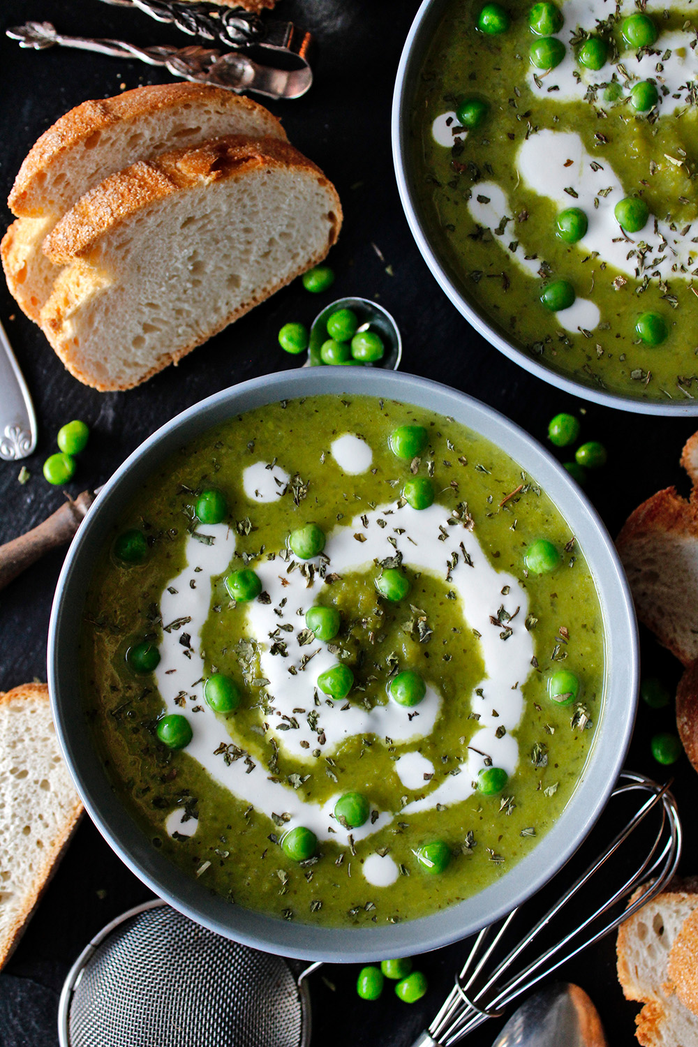 Zutaten (6 Vorspeisen-Suppen oder vier Hauptgerichte): 1 Kilogramm Erbsen | 250 Gramm Zwiebel | 50 Gramm Butter (Margarine oder Öl für eine vegane Version) | 3 Esslöffel Zucker | 1 Esslöffel getrocknete Minze | 1 Teelöffel Natron | 2 Liter Gemüsefond | 100 Milliliter (vegane) Sahne (zum Einkochen weglassen oder durch eine einkochbare Sahne ersetzen) | Salz | Optional: 2 Esslöffel Creme fraiche bzw. Creme vega, frische Erbsen und Minze
