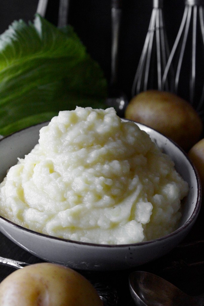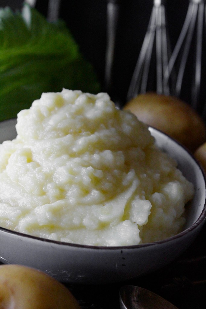 Zutaten (4 Portionen): 1 Kilo Kartoffeln (mehligkochend) | 200 Milliliter (pflanzliche Milch) | 100 Gramm (vegane) Butter | 0,5 Esslöffel Salz