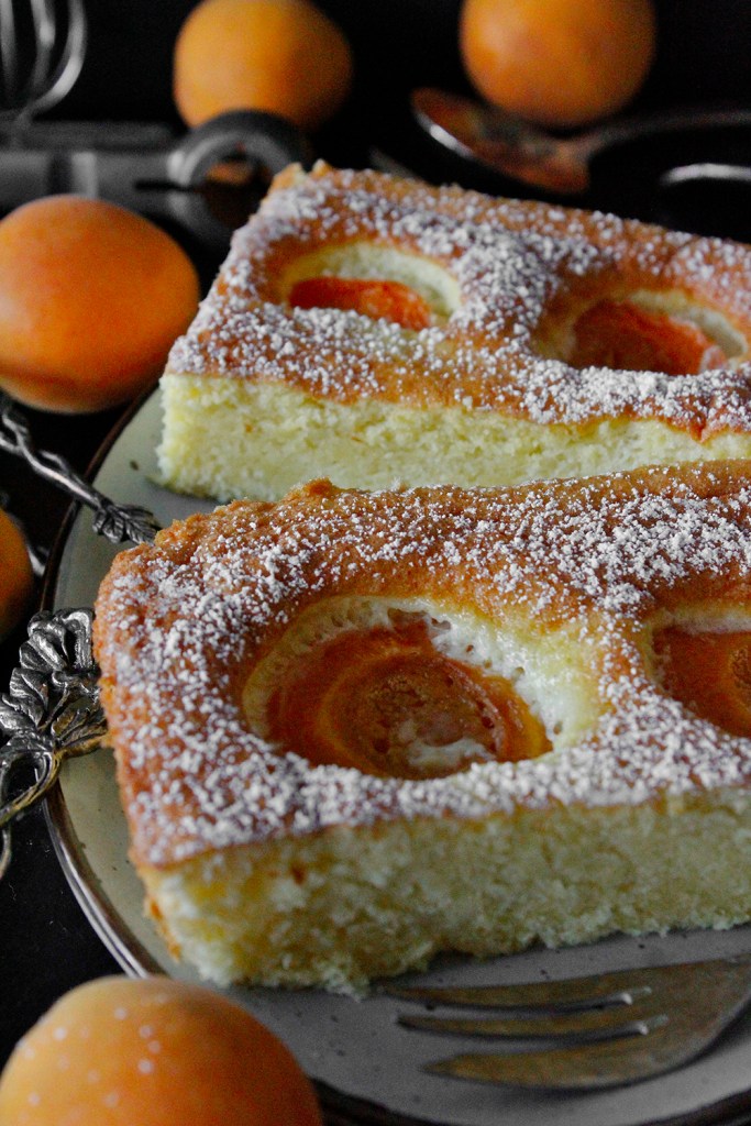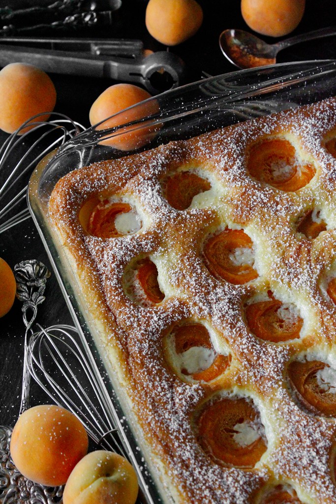 Zutaten (12 Portionen): 12 große Marillen | 8 Eier | 220 Gramm Zucker | 2 Teelöffel Vanillezucker | 1 Teelöffel Salz | 150 Milliliter Sahne | 50 Milliliter Orangensaft | Orangenabrieb | 300 Gramm Mehl | 1 Teelöffel Öl | Puderzucker