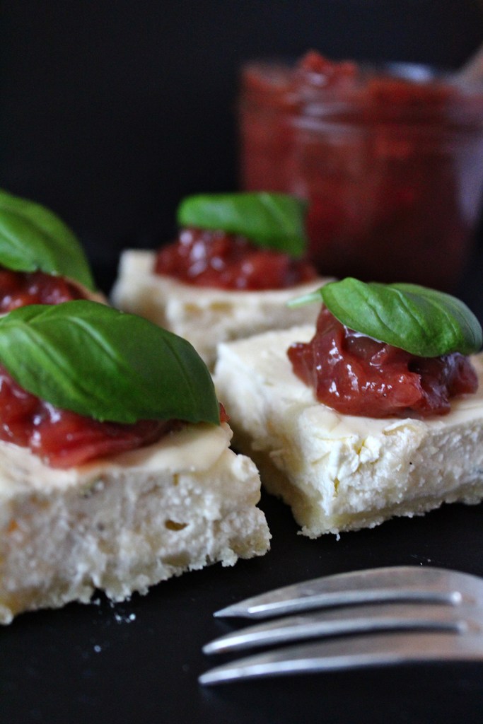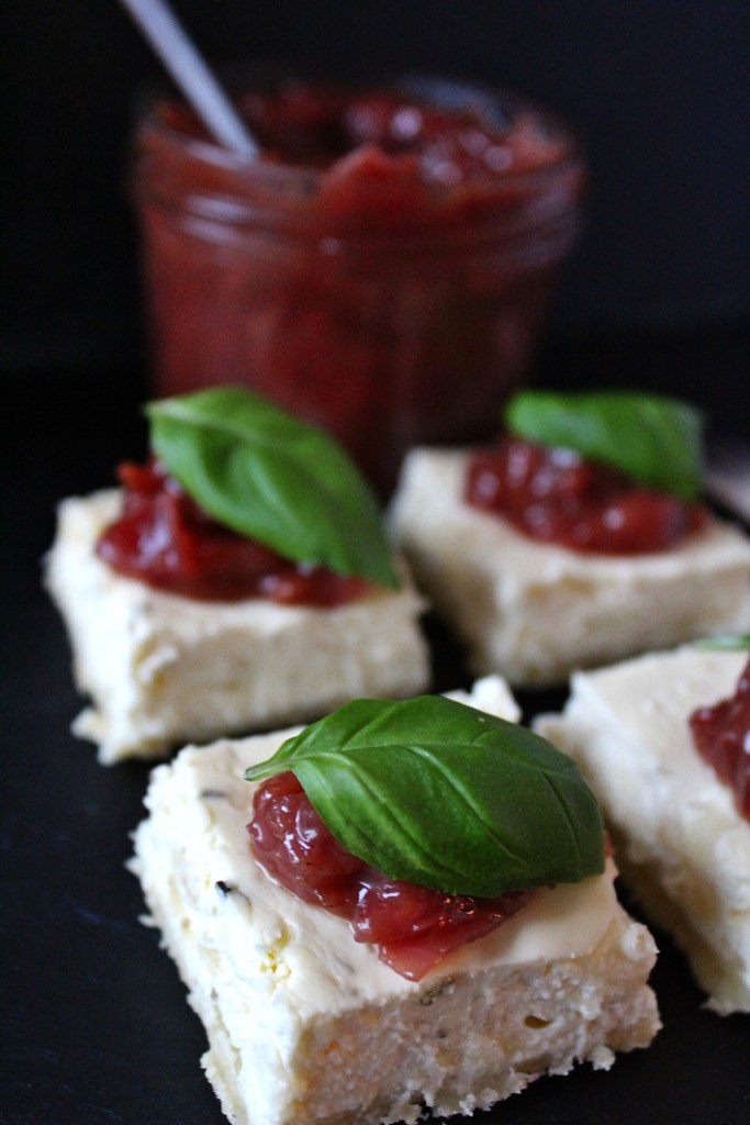 Zubereitung (40 Minuten): 1. Backofen auf 180 Grad vorheizen. 2. Mehl und Butter zu einem Mürbeteig verkneten. 3. Teig auf einem mit Backpapier ausgelegtem Backblech ausrollen. 4. Frischkäse, Parmesan, Eier, Salz und Pfeffer miteinander vermengen. 5. Tortenring auf dem Teig platzieren und Käsemasse vorsichtig hineingießen. 6. Das Ganze circa 20 Minuten backen, dann auskühlen lassen. 7. Das Gebäck in kleine Quadrate schneiden, mit Pflaumen-Chutney und Basilikumblättern dekorieren.