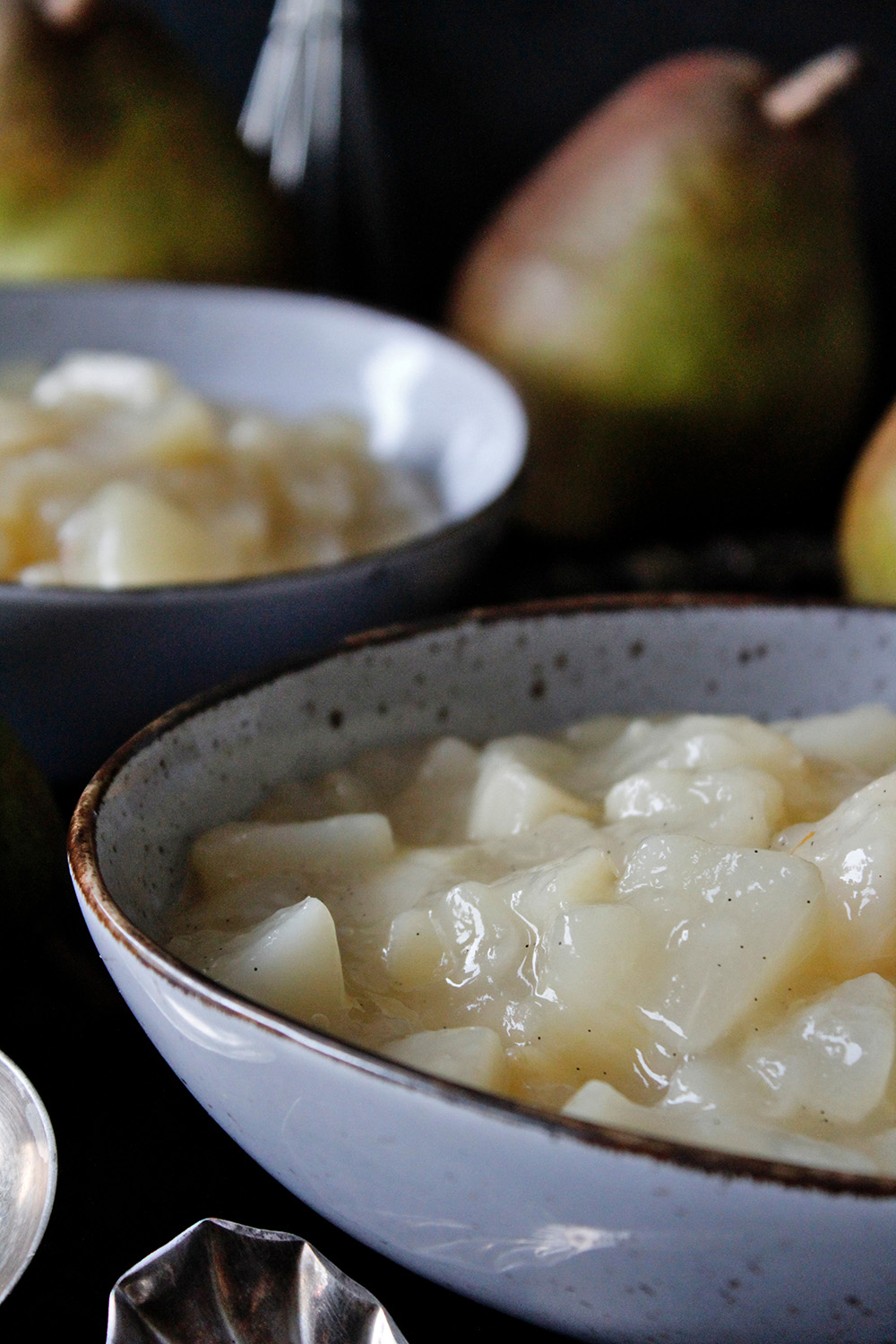 Birnen, frisch vom Baum der Nachbarin. Das ist eine meiner frühsten Kindheitserinnerungen. Am Nachmittag gab es diese dann als Birnengemüse zum Sonntagsbraten. Eine leichte Süße, eine feine Vanillenote. Das war für mich ein Gedicht. Auch heute noch gibt es das Birnenkompott aus meiner Kindheit. Als bei Beilage zu herzhaften Gerichten oder einfach als Dessert.