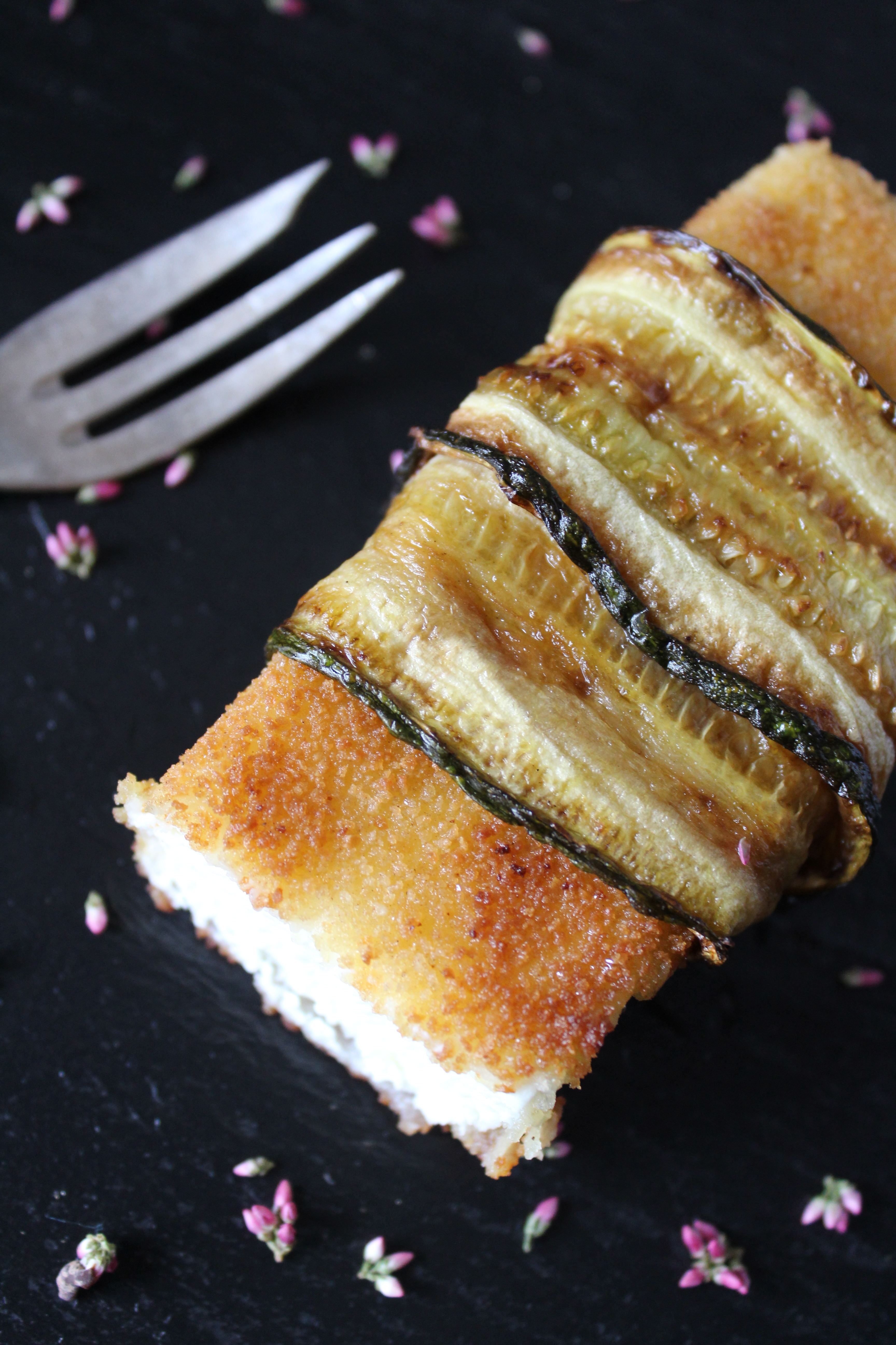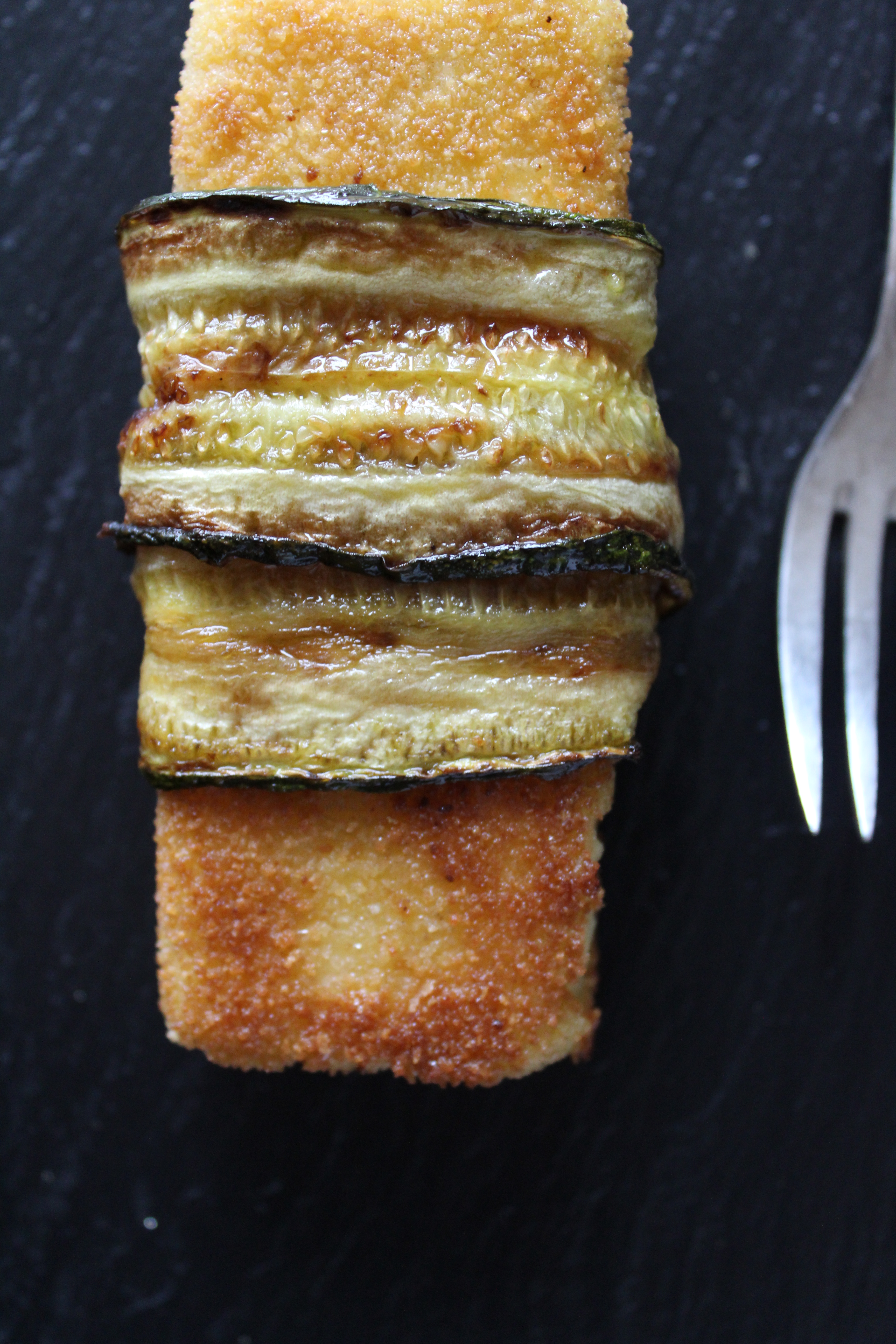 Zubereitung (15 Minuten): 1. Zucchini, waschen, abtrocknen und die Enden abschneiden. 2. Zucchini der länge nach in möglichst dünne Streifen schneiden. 3. Zucchini-Streifen in Öl anbraten, bis sie Farbe annehmen. 3. Zucchini beiseite stellen. 4. Feta der länge nach halbieren, melieren,  in verquirltes Ei tauchen und panieren. 5. Feta vorsichtig von allen Seiten goldgelb anbraten. 6. Feta direkt mit den Zucchini scheiben umwickeln und servieren.